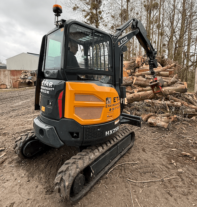 Gérard Hamon a décidé de compléter son parc avec une mini pelle. Une HX25A Z, acquise chez Blanchard TP évidemment. Séduit par sa compacité et sa polyvalence, il n’a pas hésité. « Une minipelle peut être équipée de pince godet, de cisaille, d’un broyeur forestier et/ou d’une pince à bois. C’est ce qui nous ‘offre’ une certaine polyvalence dans notre activité. Cette dernière, équipée d’une grille de protection frontale et d’une attache rapide, est principalement équipée d’une pince a grume et devrait travailler environ 500 heures par an. Mes deux premières pelles affichaient respectivement 8000 et 4000 heures avant leur changement ». Il voulait une pelle rapide, stable et avec une grande force d’arrachement. Et, il semble que la cacahuète de 2,6 t réponde à ses attentes.